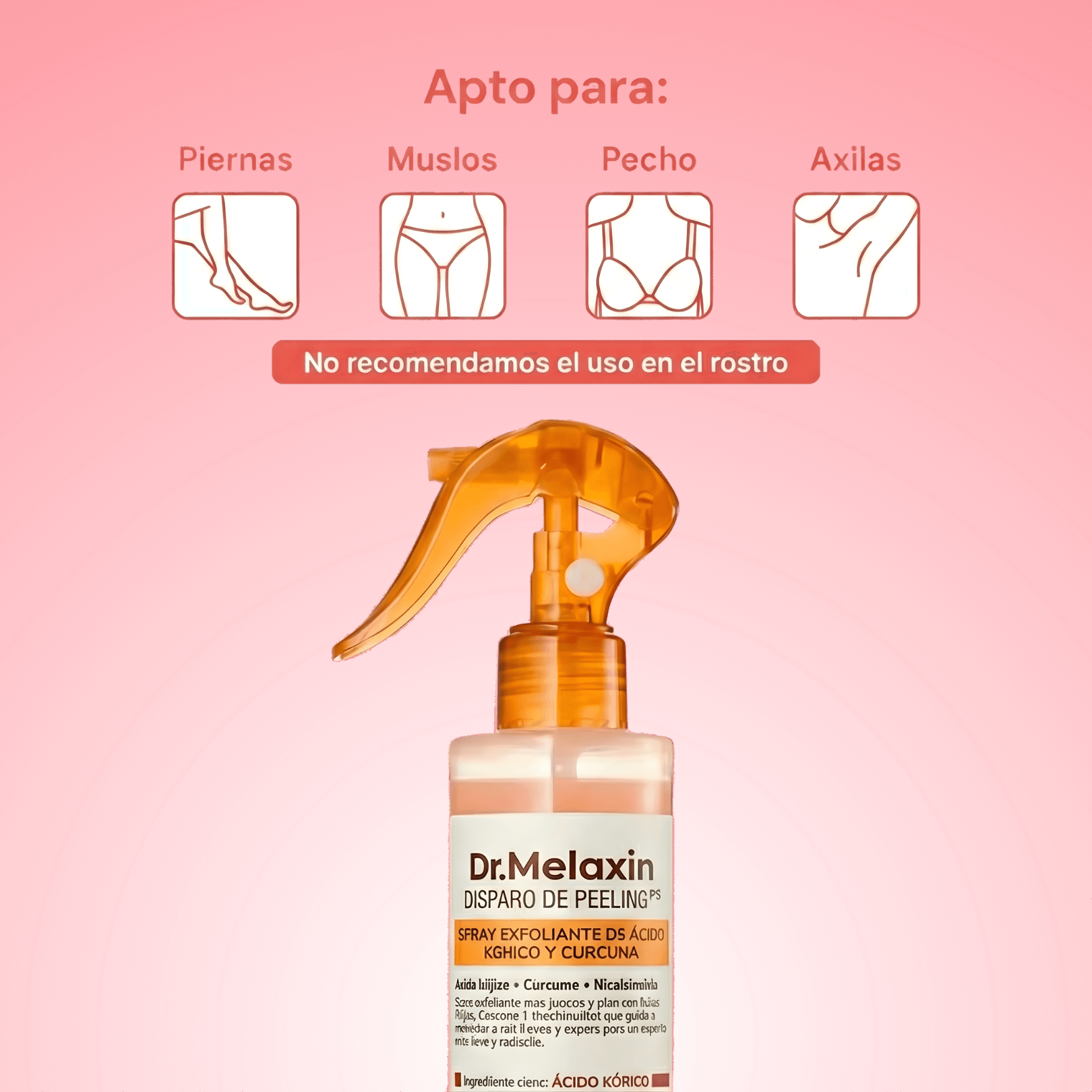 Pulverizá sobre la piel limpia y seca en las zonas que quieras tratar: axilas, entrepierna, zona del bikini, rodillas, codos, cuello o glúteos. Masajeá suavemente hasta que se absorba. Se recomienda usarlo de 3 a 5 veces por semana para mejores resultados.