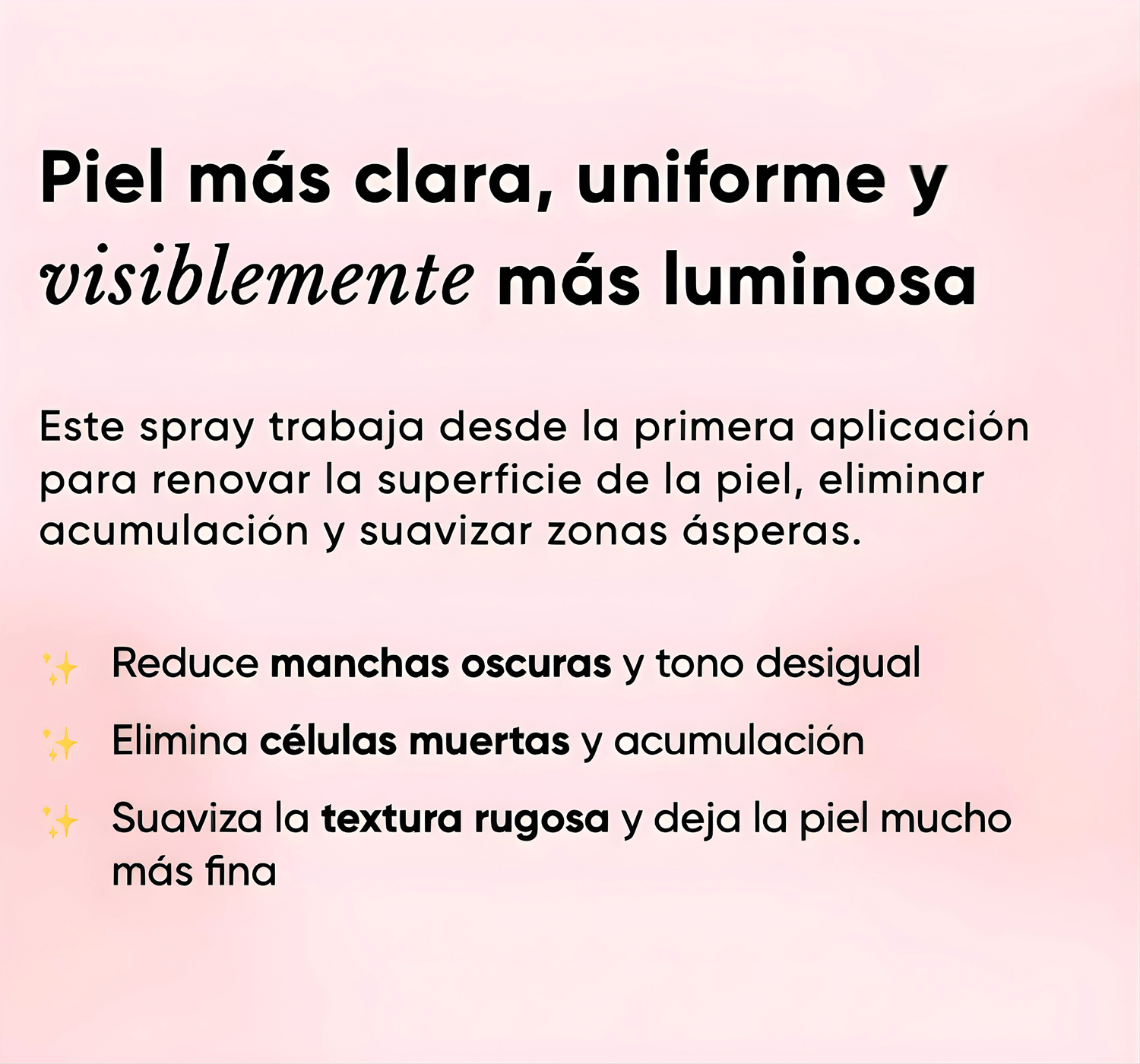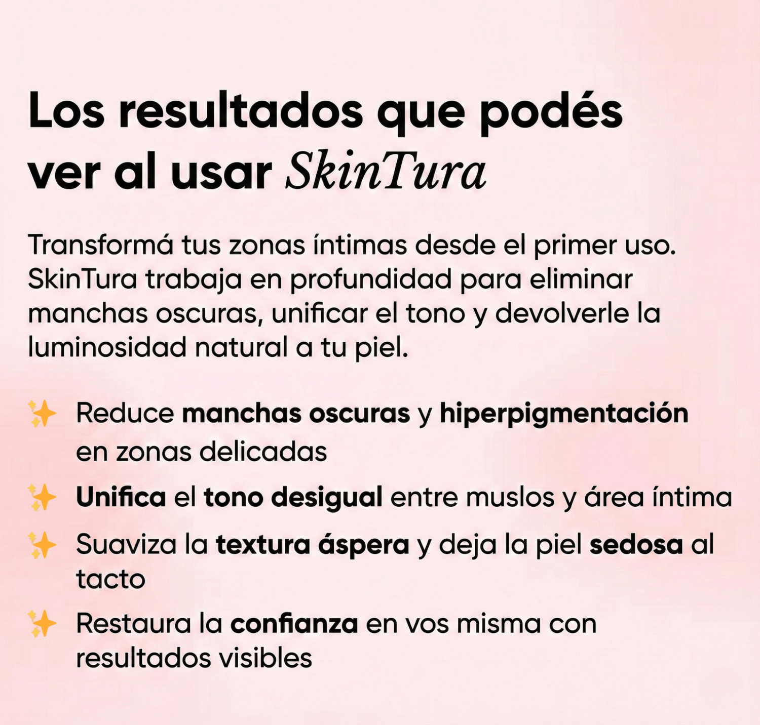 La mayoría nota la piel más luminosa y suave desde el primer uso. Para manchas más oscuras o antiguas (como las de fricción en axilas o entrepierna), los cambios visibles en el tono suelen notarse entre 1 y 2 semanas de uso constante.